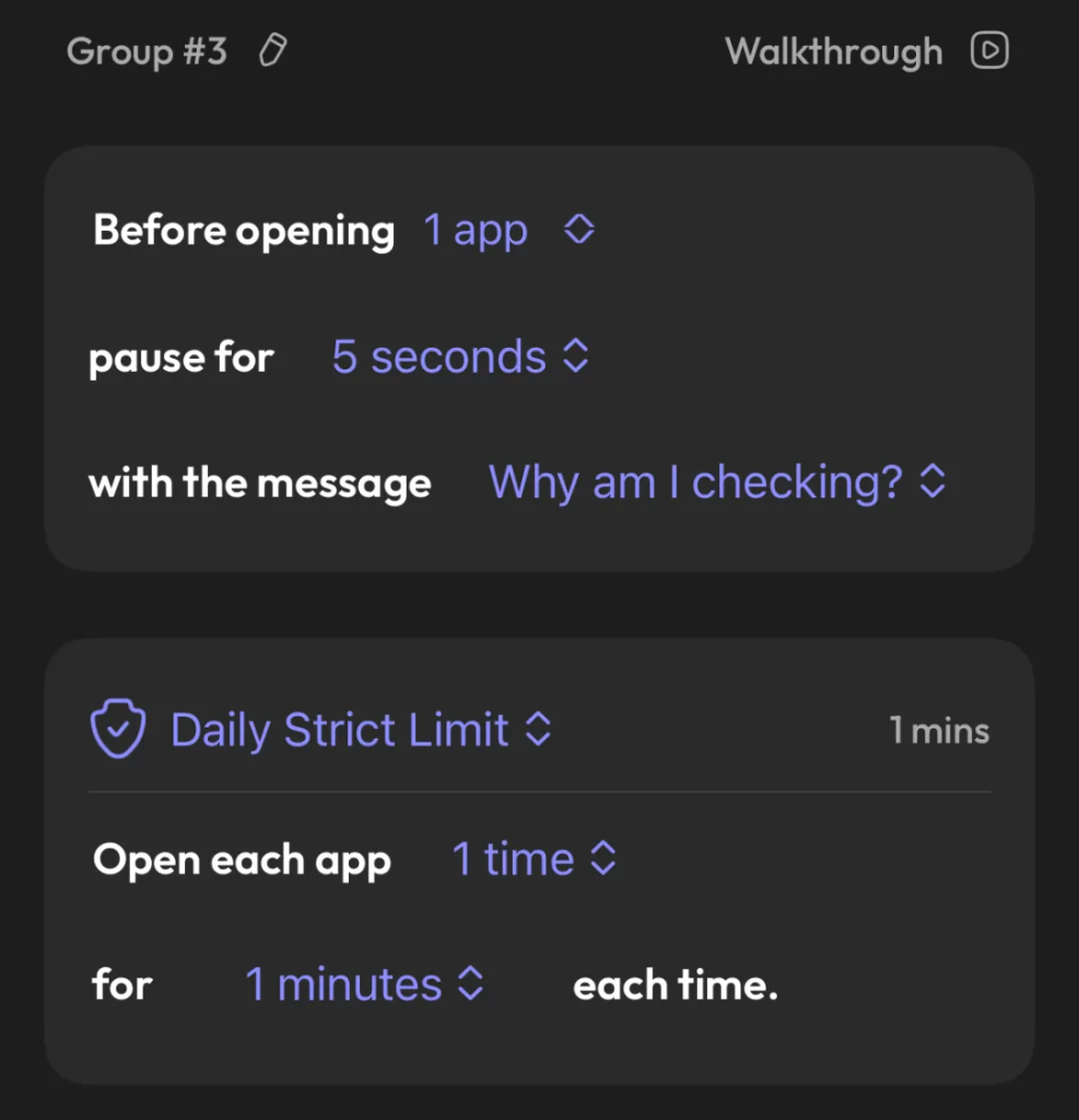 但是很多功能都没有了,比如当超时后,本来screenzen会打断你使用这个app,但是使用快捷指令设置的app超时之后,仍然能继续使用,效果就差了很多。